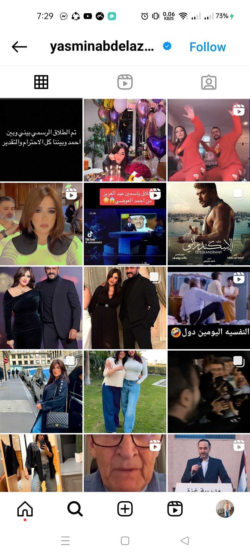 وكانت كتبت ياسمين عبد العزيز عبر خاصية استوري على حسابها الرسمي بموقع تبادل الصور والفيديوهات القصيرة إنستجرام في تعليق يرصده تحيا مصر: تم الانفصال الرسمي بيني وبين أحمد وبيننا كل الاحترام والتقدير.