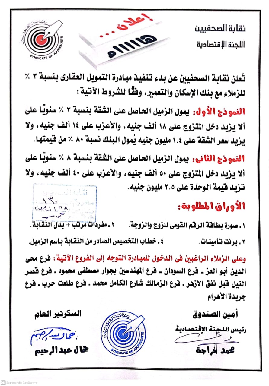 اللجنة الاقتصادية بنقابة الصحفيين تعلن تفاصيل مبادرة التمويل العقاري