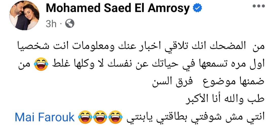 وكتب محمد العمروسي في منشور يرصده تحيا مصر عبر حسابه الرسمي بموقع التواصل الاجتماعي فيسبوك: من المضحك أنك تلاقي أخبار عنك أنت شخصيًا أول مرة تسمعها في حياتك لا وكلها غلط من ضمنها موضوع فرق السن.. طب والله أنا الأكبر.. أنت مش شوفتي بطاقتي يا بنتي، في إشارة منه إلى خطيبته مي فاروق