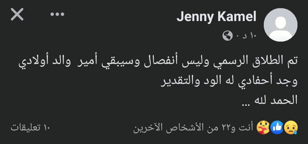 وكتبت جيني كامل في منشورها الذي رصده موقع تحيا مصر: تم الطلاق الرسمي وليس أنفصال وسيبقى أمير والد أولادي وجد أحفادي له الود والتقدير، الحمد لله.