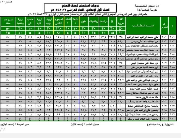 توزيع درجات الصف الأول الإعدادي الدراسات الاجتماعية: 40 درجة.