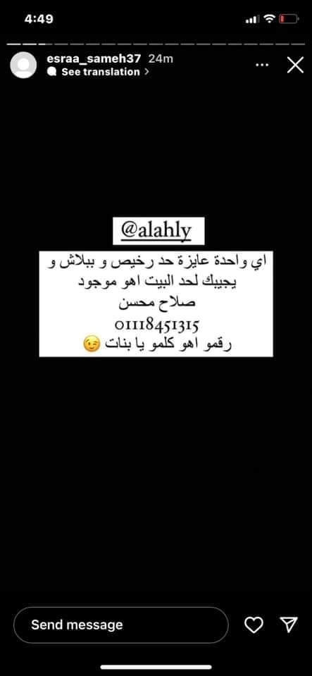 ونشر حساب يدعى إسراء سامح أنها زوجه اللاعب عدد كبير من المحادثات بين صلاح محسن وعدد كبير من المعجبات على موقع التواصل الاجتماعي سناب شات.