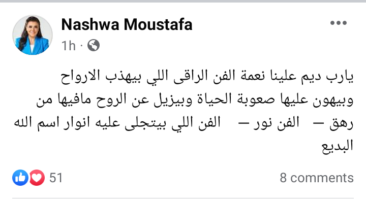 وكتبت نشوى مصطفى عبر حسابها الرسمي بموقع التواصل الاجتماعي فيسبوك في منشور رصده موقع تحيا مصر: يارب ديم علينا نعمة الفن الراقى اللي بيهذب الارواح وبيهون عليها صعوبة الحياة وبيزيل عن الروح مافيها من رهق الفن نور، الفن اللي بيتجلى عليه انوار اسم الله البديع.