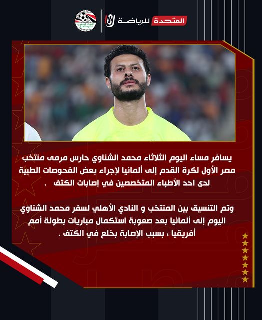 يسافر مساء اليوم الثلاثاء محمد الشناوي حارس مرمى منتخب مصر الأول لكرة القدم إلى ألمانيا لإجراء بعض الفحوصات الطبية لدى احد الأطباء المتخصصين في إصابات الكتف.
