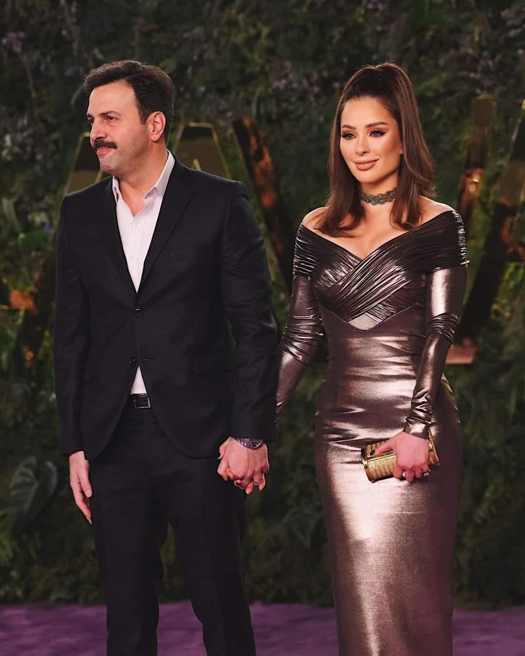 وخطف الثنائي الأنظار بسيرهما إلى جانب بعضهما البعض على السجادة الحمراء والذي رصده تحيا مصر، إذ تألقت وفاء بإطلالة ميتاليك أنيقة من قماش الساتان اللماع، تميز بقصة أوف شولدر على شكل طيات أنيقة متقاطعة، فيما جاء ضيقًا لإبراز منحنيات جسدها.