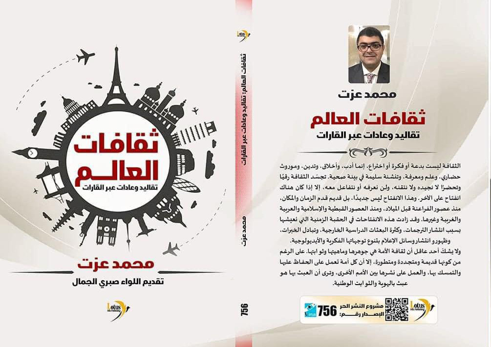 رحلة استكشافية للثقافة والهوية، من خلال نص واعد ومجهود حقيقي "، للكاتب والباحث في العلوم السياسية والتنمية المستدامة محمد عزت عبد الغفار، بعنوان "ثقافات العالم: تقاليد وعادات عبر القارات"، حيث يصدر عن دار لوتس للنشر والتوزيع، وجرى طرحه خلال فعاليات معرض القاهرة الدولي للكتاب في دورته ال55 التي انطلقت اليوم الأربعاء وتتاح للتواجد الجماهيري بداية من غد الخميس.
