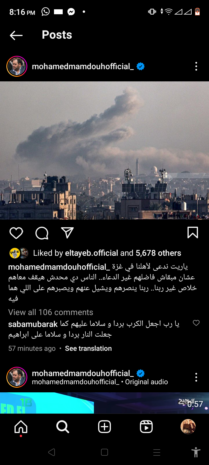 وكتب محمد ممدوح عبر حسابه الرسمي بموقع تبادل الصور والفيديوهات انستجرام في منشور رصده موقع تحيا مصر: ياريت ندعى لأهلنا في غزة عشان مبقاش فاضلهم غير الدعاء.. الناس دي محدش هيقف معاهم خلاص غير ربنا.. ربنا ينصرهم ويشيل عنهم ويصبرهم على اللي هما فيه.