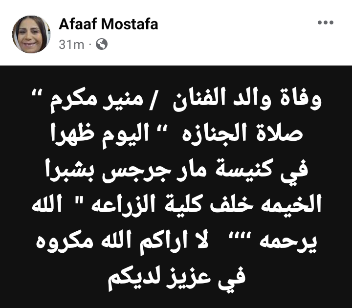 وكشفت الفنانة عفاف مصطفى منذ قليل عن موعد ومكان جنازة والد منير مكرم، حيث قالت في منشور عبر حسابها الرسمي بموقع التواصل الاجتماعي فيسبوك: وفاة والد الفنان / منير مكرم ‘‘ صلاة الجنازه ‘‘ اليوم ظهرا في كنيسة مار جرجس بشبرا الخيمه خلف كلية الزراعه " الله يرحمه ‘‘‘‘ لا اراكم الله مكروه في عزيز لديكم.
