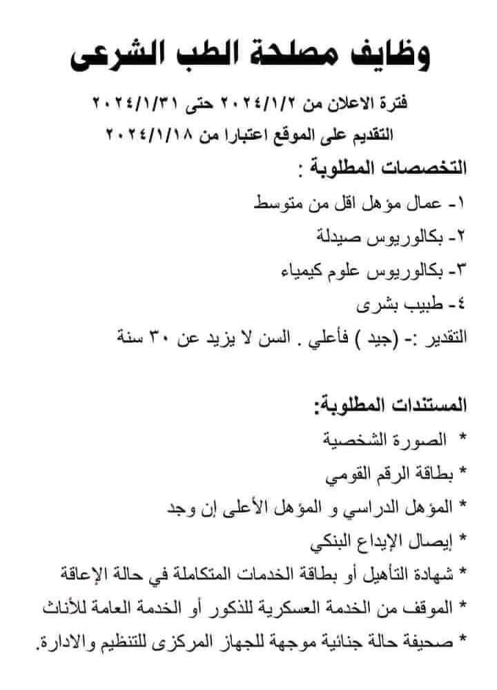 حيث أعلنت مصلحة الطب الشرعى بوزارة العدل عن حاجتها للوظائف الآتية: