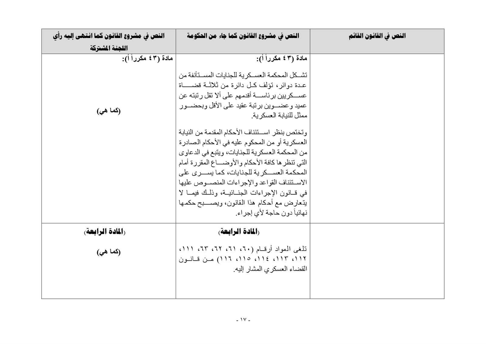 وخلال الاجتماع أشاد أعضاء اللجنة بمشروع القانون لما يحققه من ضمانات أكثر للمتهم الصادر ضده أحكام من المحكمة العسكرية للجنايات، فضلاً عن كونه التزام دستوري وفقاً للمادة (٢٤٠) من الدستور التي ألزمت الدولة بتوفير الإمكانيات المتعلقة باستئناف الأحكام الصادرة في الجنايات.