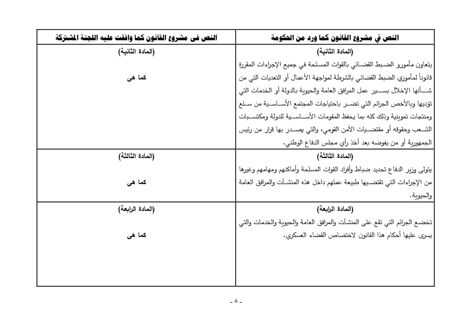 المادة الثالثة يتولى وزير الدفاع تحديد ضباط وأفراد القوات المسلحة وأماكنهم ومهامهم وغيرها من الإجراءات التى تقتضيها طبيعة عملهم داخل هذه المنشأت والمرافق العامة والحيوية، فيما تنص المادة الرابعة بأن تخض الجرائم التى تقع على المنشأت والمرافق العامة والحيوية والخدمات والتى يسرى عليها أحكام هذا القانون لاختصاص القضاء العسكرى.