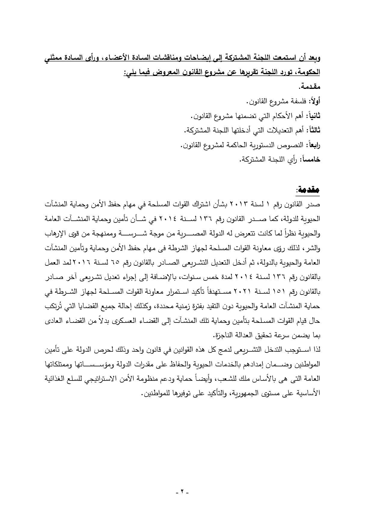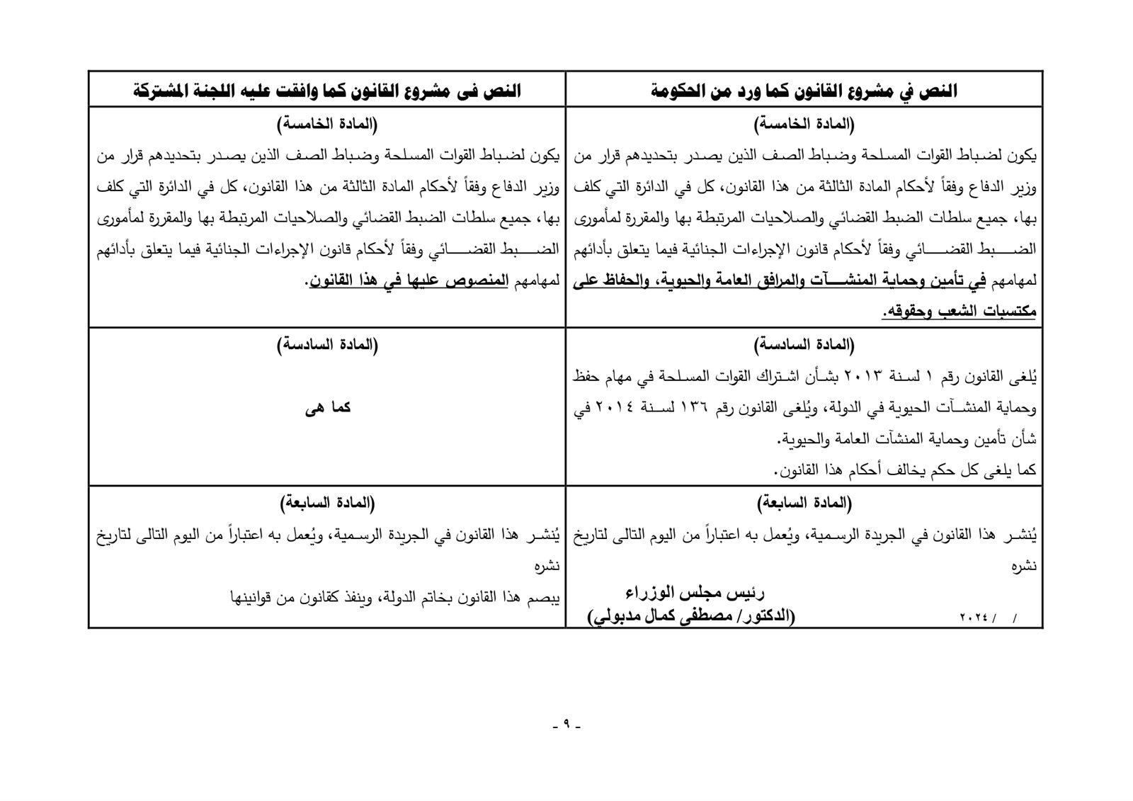 ونصت المادة الثانية على أن يتعاون مأمورو الضبط القضائى بالقوات المسلحة فى جميع الإجراءات المقررة قانونا لمأمورى الضبط القضائى بالشرطة لمواجهة الأعمال أو التعديات التى من شأنها الإخلال بسير عمل المرافق العامة والحيوية بالدولة أو الخدمات التى تؤديها وبالأخض الجرائم التى تضر باحتياجات المجتمع الأساسية من سلع ومنتجات تموينة وذلك كل بما يحفظ المقومات الأساسية للدولة ومكتسبات الشعب وحقوقه أو مقتضيات الأمن القومى والتى يصدر بها قرار من رئيس الجمهورية أو من يفوضه بعد أخذ رأى مجلس الدفاع الوطنى.