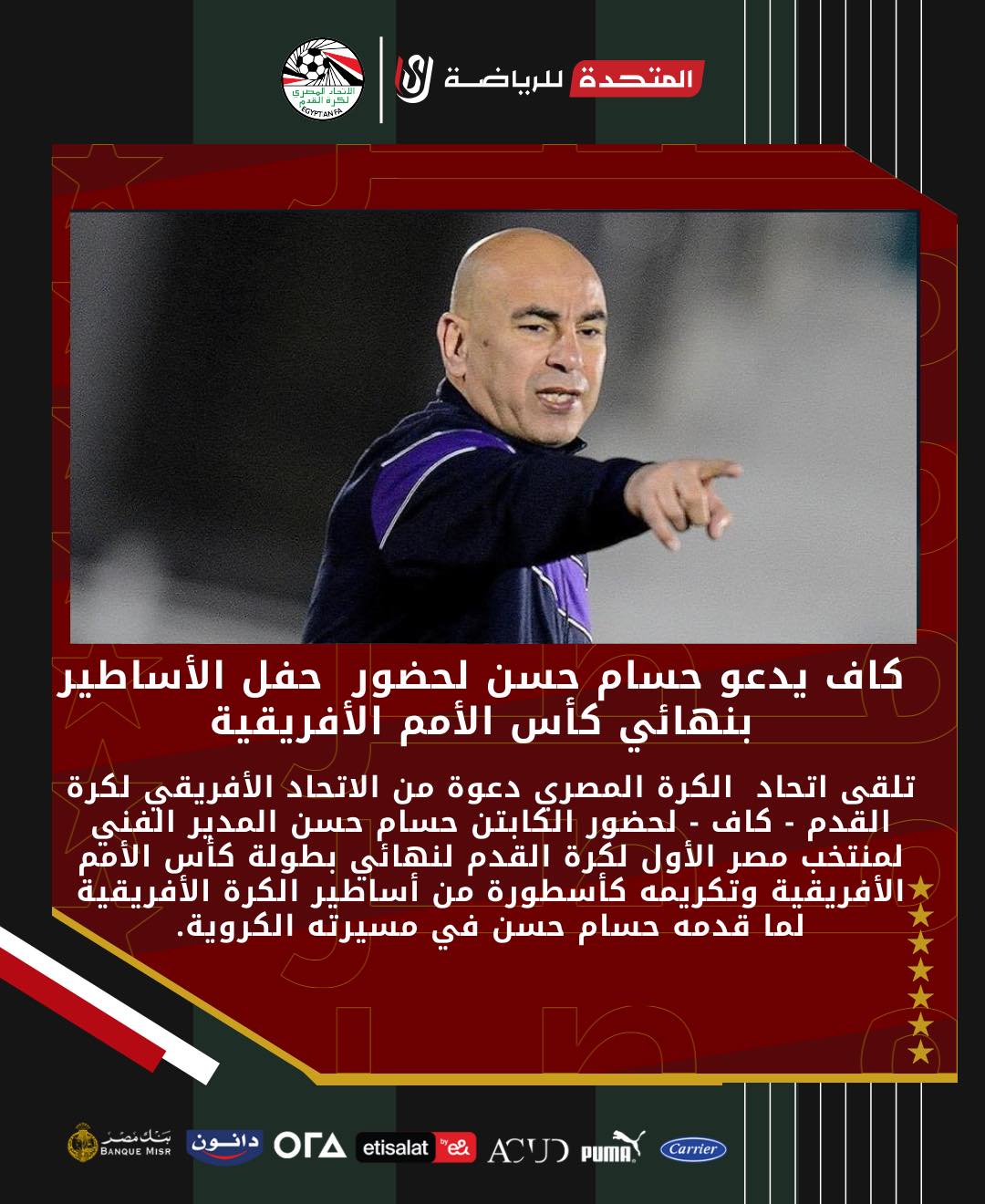 تلقى اتحاد الكرة المصري دعوة من الاتحاد الأفريقي لكرة القدم - كاف - لحضور الكابتن حسام حسن المدير الفني لمنتخب مصر الأول لكرة القدم لنهائي بطولة كأس الأمم الأفريقية وتكريمه كأسطورة من أساطير الكرة الأفريقية لما قدمه حسام حسن في مسيرته الكروية .