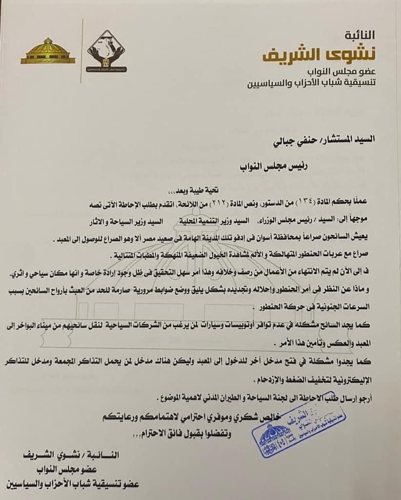 وأوضح بيان النائية نشوى الشريف، عضو لجنة السياحة بمجلس النواب عن تنسيقية شباب الأحزاب، أنه كان بصحبتها، المهندسة فاطمة إبراهيم سكرتير عام أسوان، ودكتور عبد المنعم سعيد مدير عام آثار أسوان والنوبة والمشرف العام على مكتب سياحة وأثار أسوان، ورئيس الوحدة المحلية لمركز ومدينة أدفو.