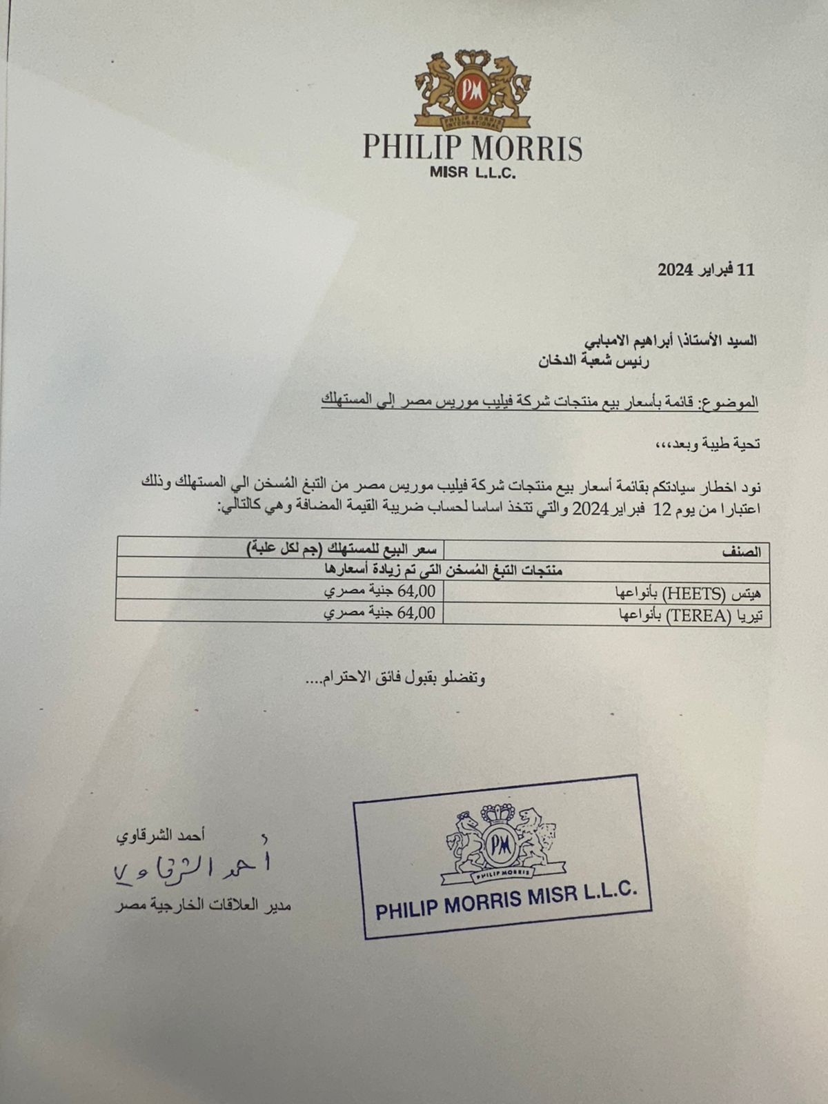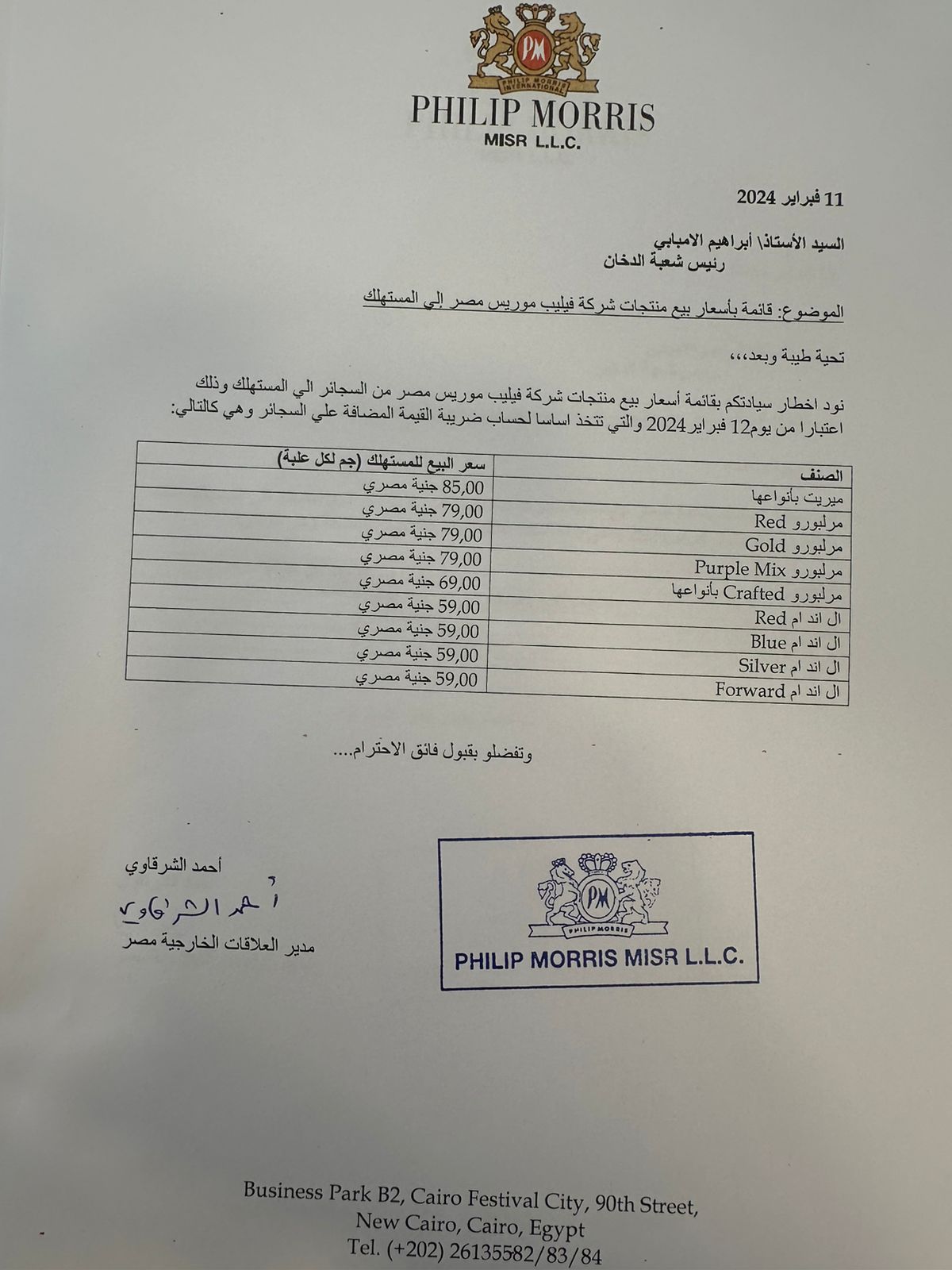 وجاء نص خطاب شركة فيليب موريس مصر، الموجه إلى رئيس شعبة الدخان، كالتالي: "نود إخطاركم بقائمة أسعار بيع منتجات شركة فيليب موريس مصر من السجائر إلى المستهلك وذلك اعتبارا من يوم الإثنين 12 فبراير 2024، والتي تتخذ أساسا لحساب ضريبة القيمة المضافة على السجائر، وهي كالتالي: