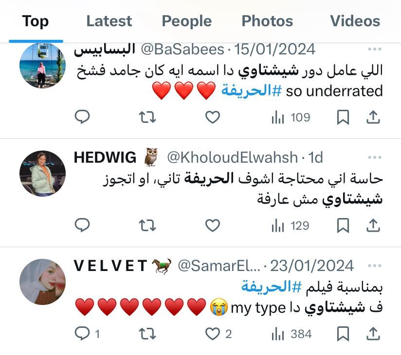 وعن ششتاوي أيضاً كتبت ندى هيبة "أخيرا عرفت أشوف فيلم الحريفة وفهمت إيه سبب الضجة الفظيعة على ششتاوي .. معاهم حق صراحة"، وعن رأيها في الفيلم وأبطاله كتبت منى ياسر "فيلم الحريفة تحفة ... أنا دلوقت طالعة من الفيلم عايزة حد في رومانسية ماجد وخفة دم حتة وشخصية ششتاوي".
