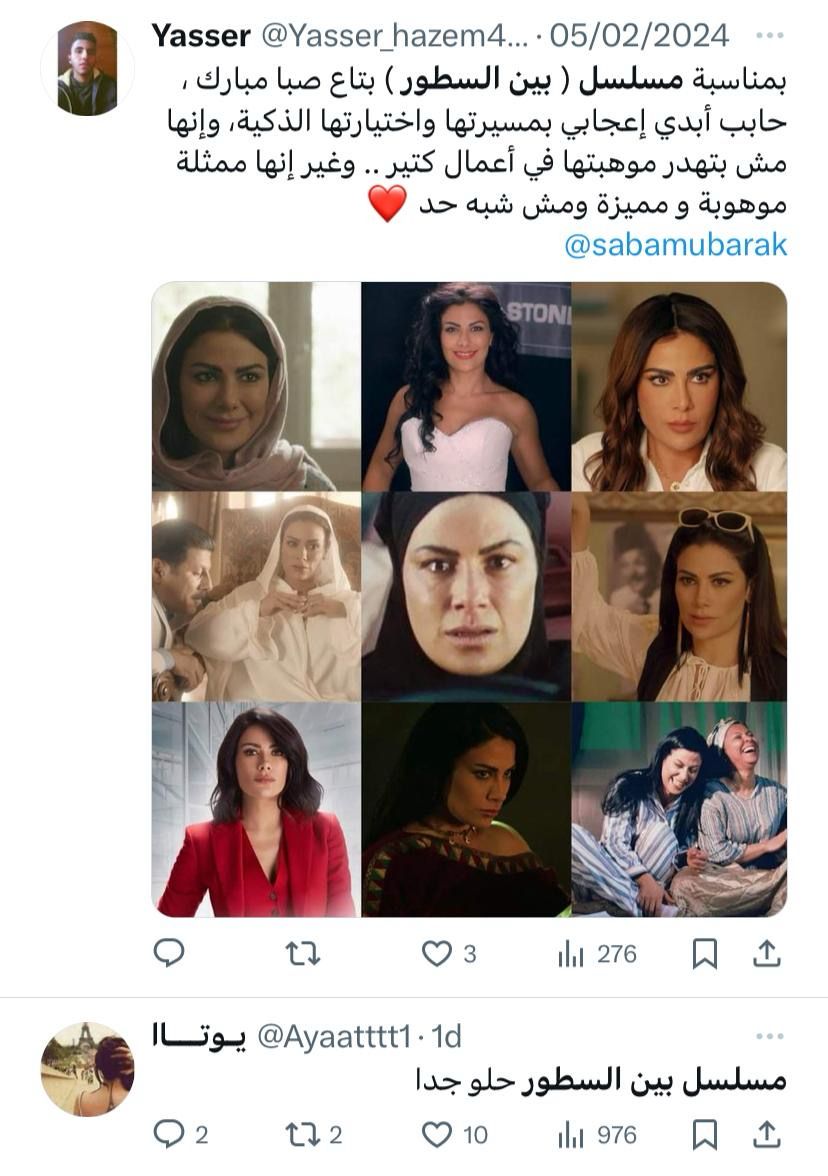 إشادات الجمهور بأداء صبا مبارك في مسلسل بين السطور