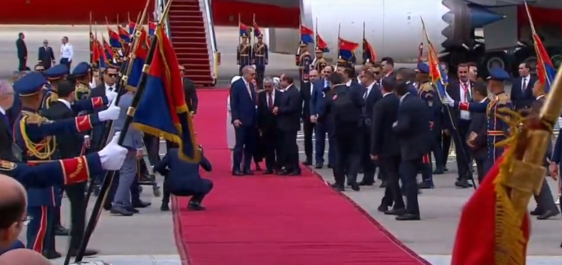 وذكرت مصادر مطلعة بالمطار وصل الرئيس التركي والوفد المرافق له، وكان في استقباله الرئيس عبد الفتاح السيسي باستراحة رئاسة الجمهورية بالمطار.