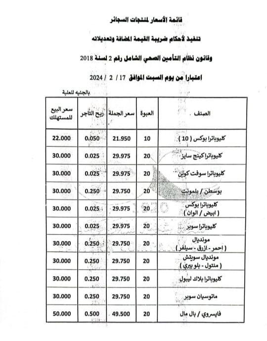 ينشر موقع تحيا مصر أسعار منتجات المعسلات من شركة الشرقية للدخان بعد زيادة أسعارها وكذلك أسعار السجائر الأخيرة، والتي جاءت تنفذًا لأحكام ضريبة القيمة المضافة وتعديلاته، وقانون نظام التأمين الصحي الشامل رقم 2 لسنة 2018، حيث تطبق تلك الزيادة بعد قرار الشركة بزيادة أسعار منتجاتها.