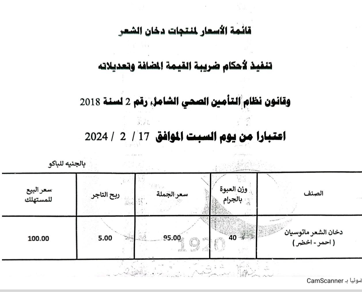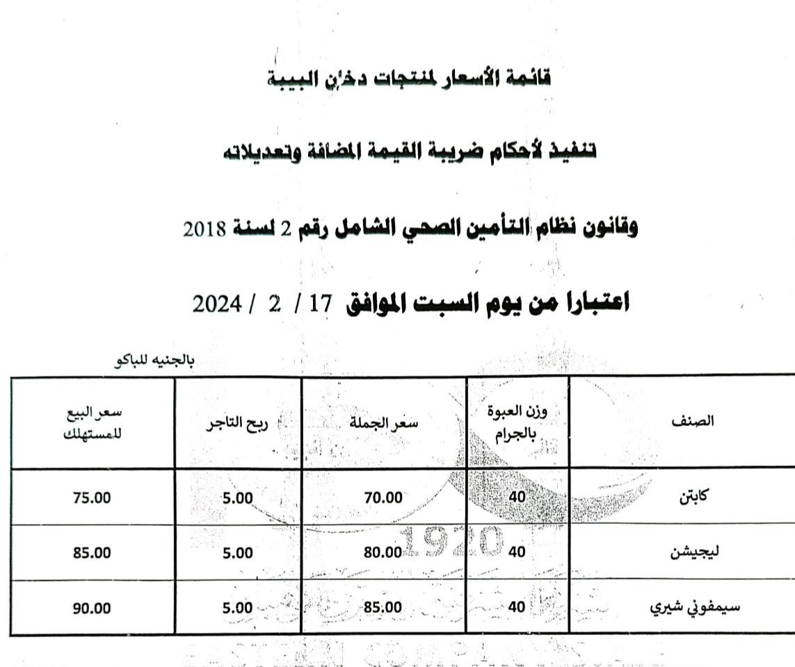 وفي التقرير التالي، يستعرض موقع تحيا مصر قائمة أسعار لـ منتجات المعسلات، تنفيذًا لأحكم ضريبة القمية المضافة وقانون التأمين الصاحي الشامل.