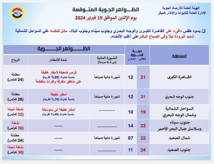 واوضحت أن يشهد اليوم الإثنين الموافق 19 فبراير 2024 شبورة مائية صباحاً على بعض الطرق الزراعية والسريعة والقريبة من المسطحات المائية المؤدية من والى مناطق من القاهرة الكبرى والوجه البحري ومدن القناة وشمال الصعيد.