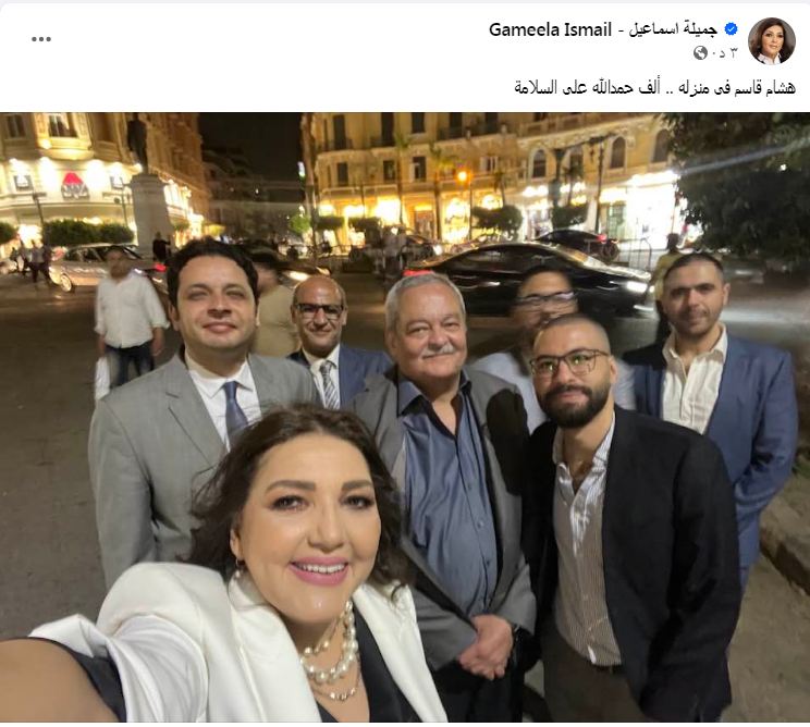 ونشرت جميلة إسماعيل صورة تجمعها بهشام قاسم، وعدد من الأشخاص الآخرين، معلقة عليها: "هشام قاسم فى منزله .. ألف حمدالله على السلامة".