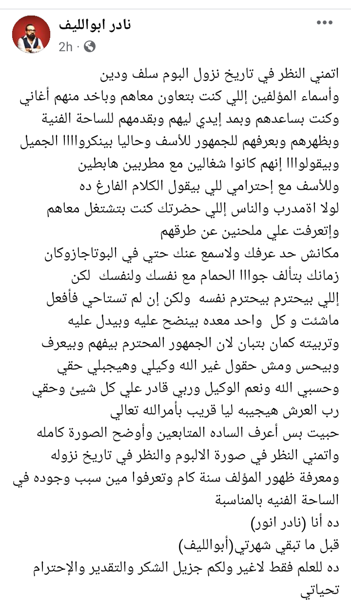 وكتب نادر أبو الليف في منشور رصده موقع تحيا مصر: اتمني النظر في تاريخ نزول البوم سلف ودين وأسماء المؤلفين إللي كنت بتعاون معاهم وباخد منهم أغاني وكنت بساعدهم وبمد إيدي ليهم وبقدمهم للساحة الفنية وبظهرهم وبعرفهم للجمهور للأسف وحاليا بينكروا الجميل وبيقولوا إنهم كانوا شغالين مع مطربين هابطين.. وللأسف مع إحترامي للي بيقول الكلام الفارغ ده ولولايا أنا مدرب والناس إللي حضرتك كنت بتشتغل معاهم وإتعرفت علي ملحنين عن طرقهم مكانش حد عرفك ولاسمع عنك حتي في البوتاجازوكان زمانك بتألف جوا الحمام مع نفسك ولنفسك.