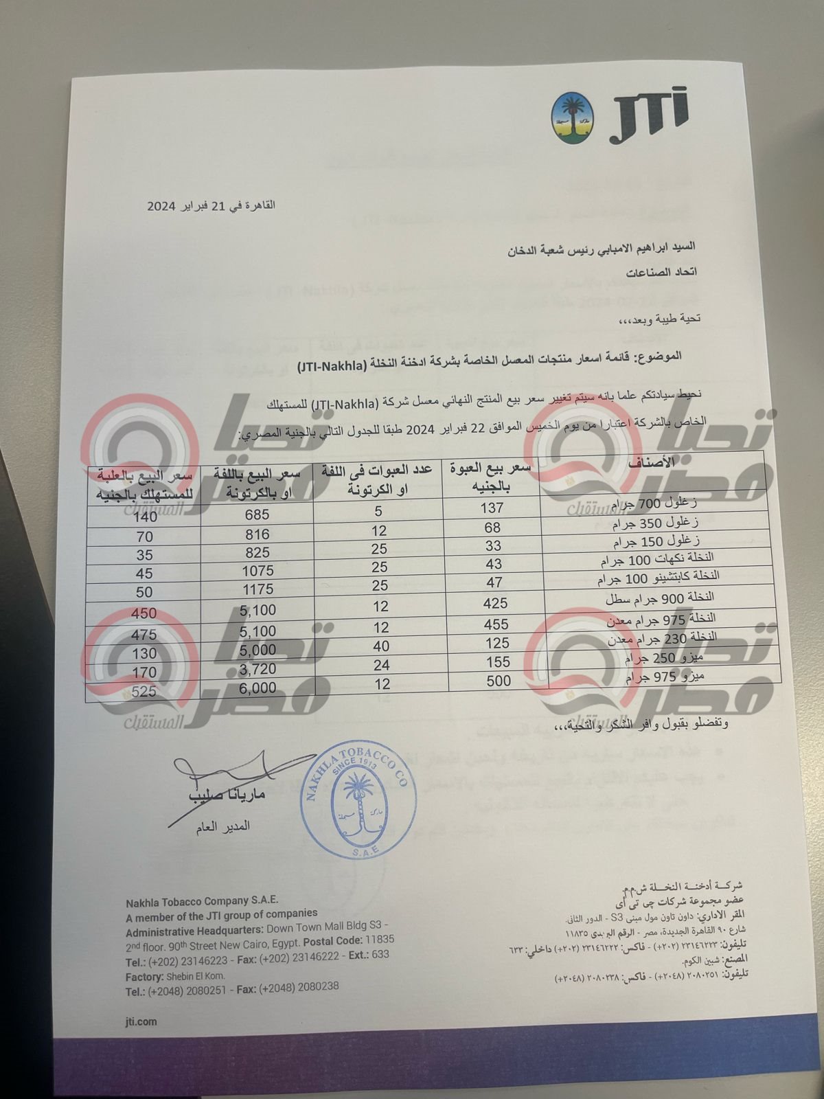 وذكرت الشركة في الخطاب المرسل حصل عليه تحيا مصر: "نحيط سيادتكم علما بأنه سيتم تغيير سعر بيع المنتج النهائي لمعسل شركة ادخنة النخلة للمستهلك الخاص بالشركة، اعتبارًا من يوم الخميس الموافقة 22 فبراير 2024 طبقا للجدول التالي بالجنيه المصري: