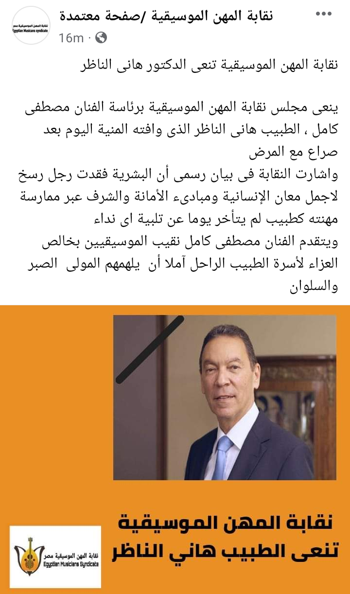 وجاء في بيان نقابة المهن الموسيقية الذي رصده موقع تحيا مصر منذ قليل: ينعى مجلس نقابة المهن الموسيقية برئاسة الفنان مصطفى كامل ، الطبيب هانى الناظر الذى وافته المنية اليوم بعد صراع مع المرض.