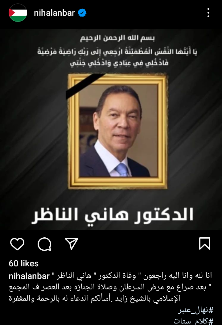 نهال عنبر تنعي هاني الناظر بكلمات مؤثرة