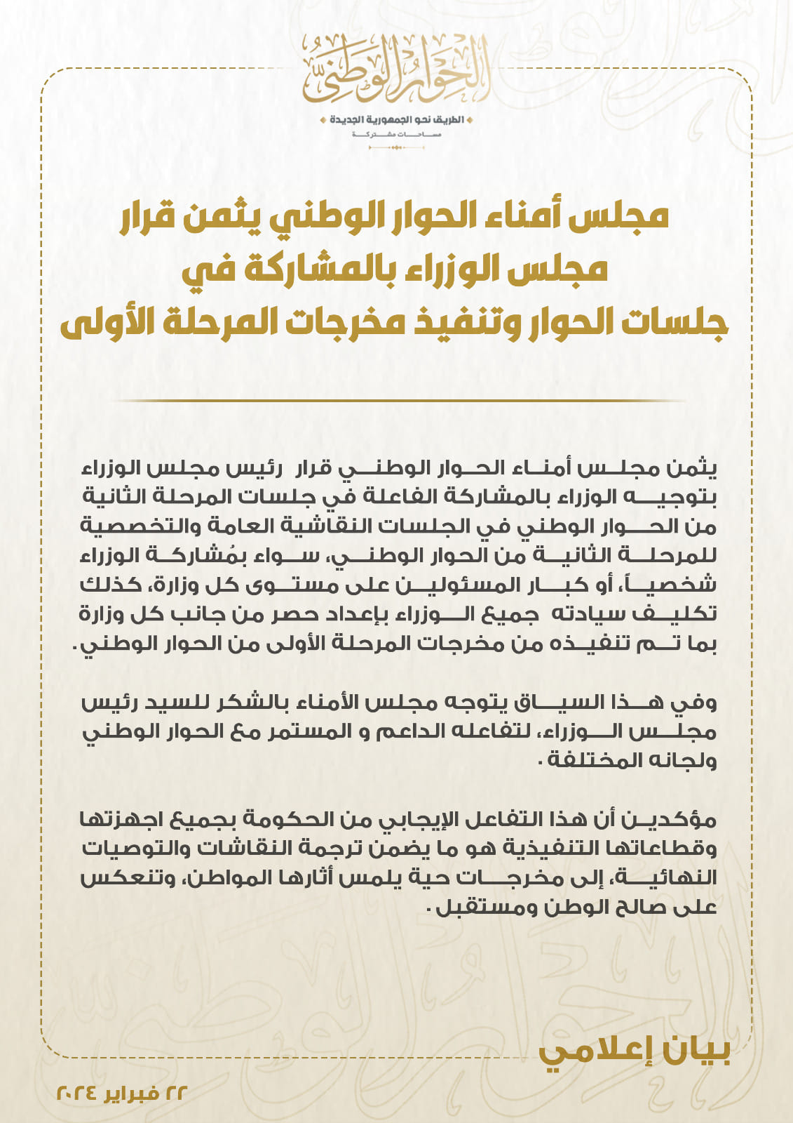 الحوار الوطني يثمن قرار مجلس الوزراء بالمشاركة في جلسات الحوار وتنفيذ مخرجات المرحلة الأولى