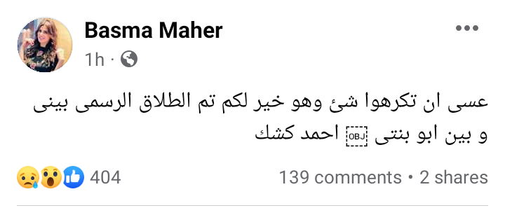 وبشكل مفاجئ خرجت الفنانة بسمة ماهر واعلنت طلاقها من الفنان أحمد كشك من خلال منشور كتبته عبر حسابها الرسمي بموقع التواصل الاجتماعي فيسبوك ورصده موقع تحيا مصر، قالت فيه: عسى أن تكرهوا شيئا وهو خير لكم، تم الطلاق الرسمي بيني وبين أبو بنتي.. أحمد كشك، وتفاعل معها محبيها وأقاربها بالدعاء لها ولطليقها.