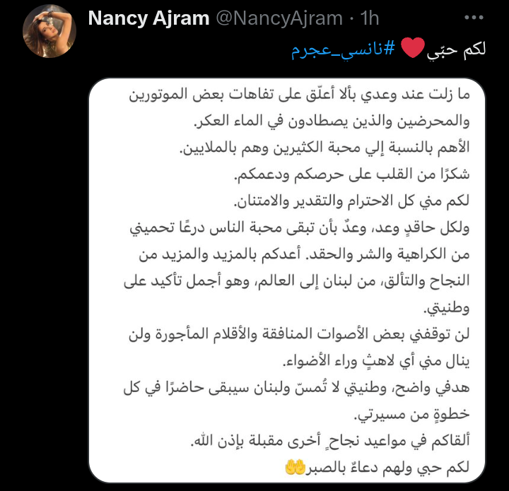 وتابعت نانسي عجرم حديثها: أعدكم بالمزيد والمزيد من النجاح والتألق من لبنان إلى العالم، وهو أجمل تأكيد على وطنيتي، لن توقفني بعض الأصوات المنافقة والأقلام المأجورة، ولن ينال مني أي لاهث وراء الأضواء، هدفي واضح، وطنيتي لا تُمس ولبنان سيبقى حاضرًا في كل خطوة من مسيرتي.. ألقاكم في مواعيد نجاح أخرى مقبلة بإذن الله، ولكم حبي ولهم دعاء بالصبر.
