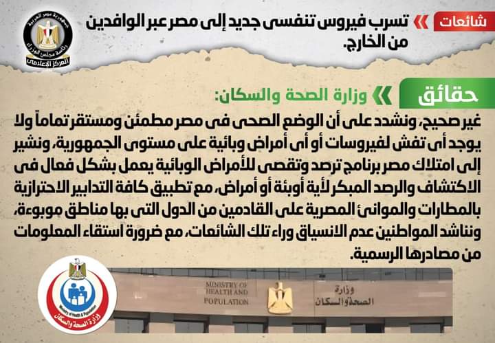 وتداولت بعض المواقع الإلكترونية وصفحات التواصل الاجتماعي أنباء بشأن تسرب فيروس تنفسي جديد إلى مصر عبر الوافدين من الخارج، وقد قام المركز الإعلامي لمجلس الوزراء بالتواصل مع وزارة الصحة والسكان، والتي نفت تلك الأنباء، مؤكدةً أنه لا صحة لتسرب فيروس تنفسي جديد إلى مصر عبر الوافدين من الخارج، مشددةً على أن الوضع الصحي في مصر مطمئن ومستقر تماماً ولا يوجد أي تفش لفيروسات أو أي أمراض وبائية على مستوى الجمهورية، مشيرةً إلى امتلاك مصر برنامج ترصد وتقصي للأمراض الوبائية يعمل بشكل فعال في الاكتشاف والرصد المبكر لأية أوبئة أو أمراض، مع تطبيق كافة التدابير الاحترازية بالمطارات والموانئ المصرية على القادمين من الدول التي بها مناطق موبوءة.