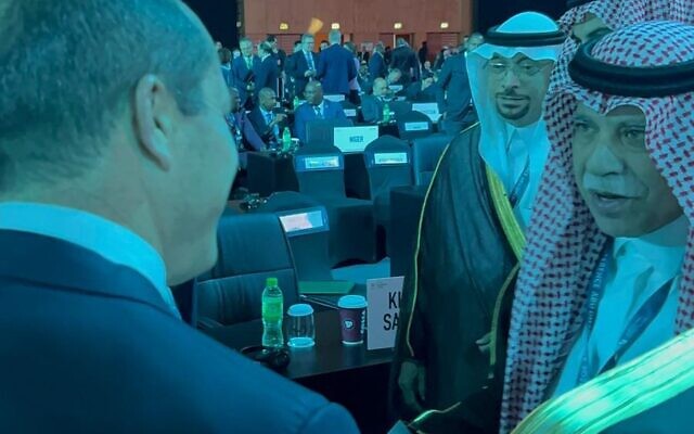 وقال وزير الاقتصاد نير بركات، في تصريحات رصدها موقع تحيا مصر، لوزير التجارة السعودي ماجد بن عبد الله القصبي أن البلدين يمكنهما “صنع التاريخ” معًاـ وفق الصحيفة العبرية فكان الوزيران يتصافحان ويتحدثان على هامش المؤتمر. كما تبادلوا بطاقات العمل.