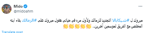 تحيا مصر، ونشر ميدو عبر حسابه الرسمي"إكس":"مبروك لـ شيكابالا التجديد للزمالك، ولأول مرة في حياتي هقول مبروك على الزمالك بقاء ابنه المخلص مع الفريق لموسمين أخرين".
