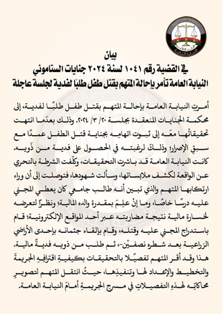 وانتهت تحقيقات النيابة مع المتهم في القضية رقم 1041 لسنة 2024 جنايات الستاموني، إلى ثبوت اتهامِه بجناية قتل الطفل عمدًا مع سبقِ الإصرار؛ وذلكَ لرغبته في الحصول على فدية من ذَويه.
