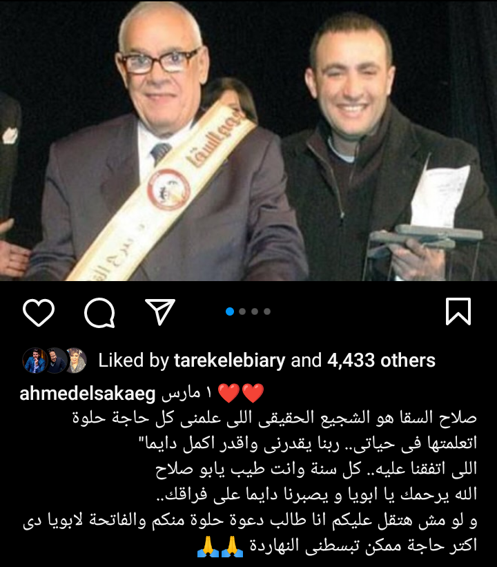 وتابع أحمد السقا حديثه، قائلا: الله يرحمك يا ابويا و يصبرنا دايما على فراقك..و لو مش هتقل عليكم انا طالب دعوة حلوة منكم والفاتحة لابويا دى اكتر حاجة ممكن تبسطنى النهاردة.