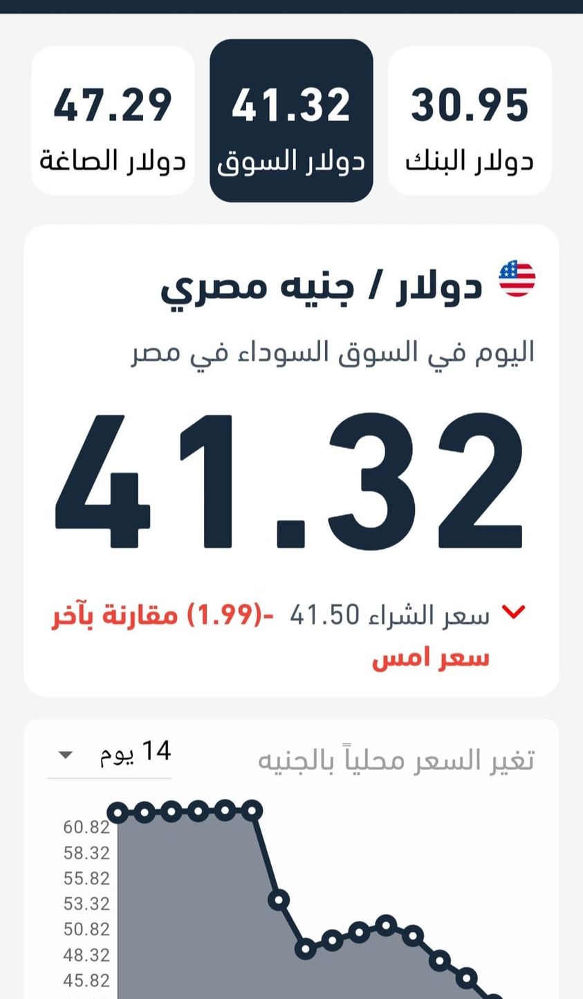 وبعد تراجعه، سجل سعر الدولار في السوق السوداء اليوم الأحد وفقا لما رصده تحيا مصر نحو 41.32 جنيه، وذلك انخفاضًا بنحو جنيهان عن التعاملات في السوق الموازية أمس السبت، حيث كان قد سجل الأخضر نحو 43 وقروش.