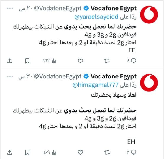 وردت خدمة عملاء فودافون مصر على شكوى أحد العملاء وأوضحت كيفية تشغيل الخدمات مرة أخرى، حيث بينت أنه من خلال عمل بحث يدوي عن الشبكات، حيث يظهر لك فودافون 2G , 3G,4G.