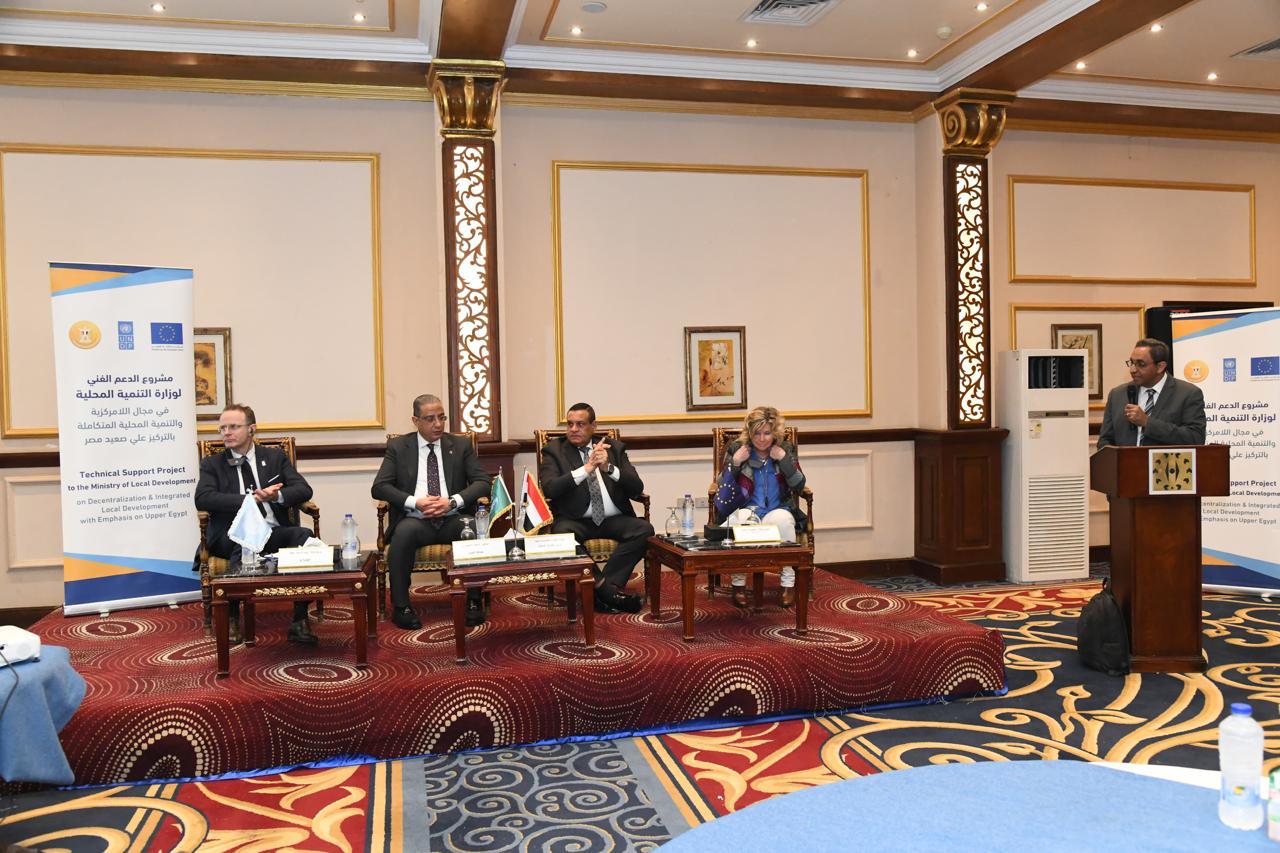 وأكد إلى أهمية الشراكة القائمة والتعاون المثمر بين وزارة التنمية المحلية والاتحاد الاوروبي وبرنامج الأمم المتحدة الإنمائي من خلال برنامج الدعم الفني للوزارة الذى يقوم بتدعيم دور الوزارة للعمل مع المحافظات على عدد من الملفات الهامة المسندة إليها، ومنها دعم التنمية الاقتصادية المحلية وتحديد عدد من المشروعات في المحافظات الأربع (الفيوم وبني سويف والاقصر وأسوان) بما يعمل على دعم الميزات النسبية بكل محافظة، وتشجيع الشراكة بين القطاعين العام والخاص من خلال تفعيل المجلس الاقتصادي الاجتماعي للمحافظة وقيامهم بدور فاعل في توجيه وتحديد المشروعات التنموية ذات الأولوية للمحافظة، لافتا إلى أن الوزارة تهتم بالتكتلات الاقتصادية بمحافظات الصعيد لتوفير فرص عمل للمواطنين وعلي رأسها الفركة والسجاد والرومان وغيرها، وكذا جذب الاستثمارات وتحسين بيئة الاستثمار تنفيذاً لتوجيهات القيادة السياسية في هذا الشأن في المناطق الصناعية بمحافظات الصعيد، مشيرا إلى أن الوزارة قامت بتكليف جميع محافظات الجمهورية بتشكيل المجلس الاقتصادي/الاجتماعي للمحافظة ليكون منصة حوار مشتركة بين الحكومة والقطاع الخاص والمجتمع المدني والجهاز التنفيذي والمستثمرين ويتم من خلاله دعم المحافظة كمجلس استشاري في توجيه واتخاذ القرار لتعزيز تنافسية المحافظة وجعلها أكثر جاذبية للاستثمار والأعمال.