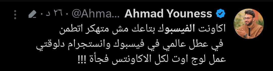 وطمأن حساب باسم أحمد حسن المتابعين، قائلا: “أكاونت الفيسبوك بتاعك مش متهكر اتطمن في عطل عالمي في فيسبوك وانستجرام دلوقتي عمل لوج اوت لكل الاكاونتس فجأ”.