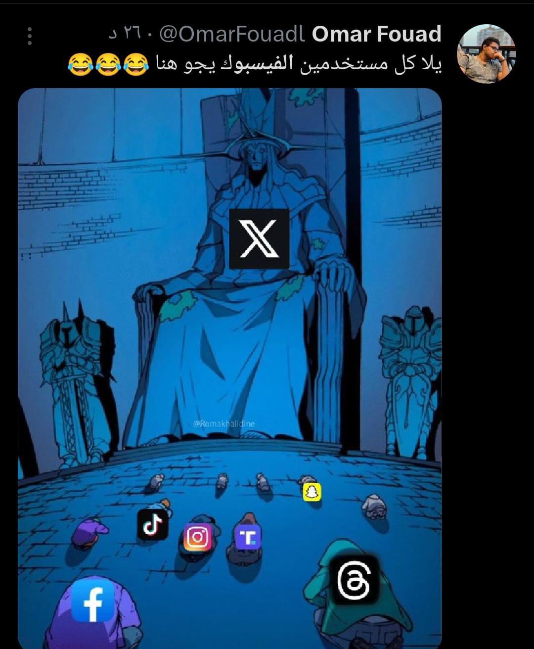 وتفاعل مستخدموا منصة “إكس” تويتر سابقًا، مع الأمر بسخرية، حيث نشر حساب باسم “عمر فؤاد”: صورة لملك يجلس على عرشه وعليه شعار منصة إكس، وتركع له منصات شركة ميتا"، معلقًا عليها:" يلا كل مستخدمي الفيسبوك ييجو هنا".