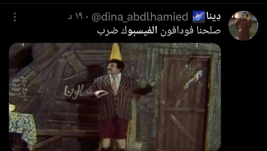 فيما سخر “دينا” قائلة: “صلحنا فودافون الفيسبوك ضرب”، مصحوبة بصورة للفنان الراحل سمير غانم.