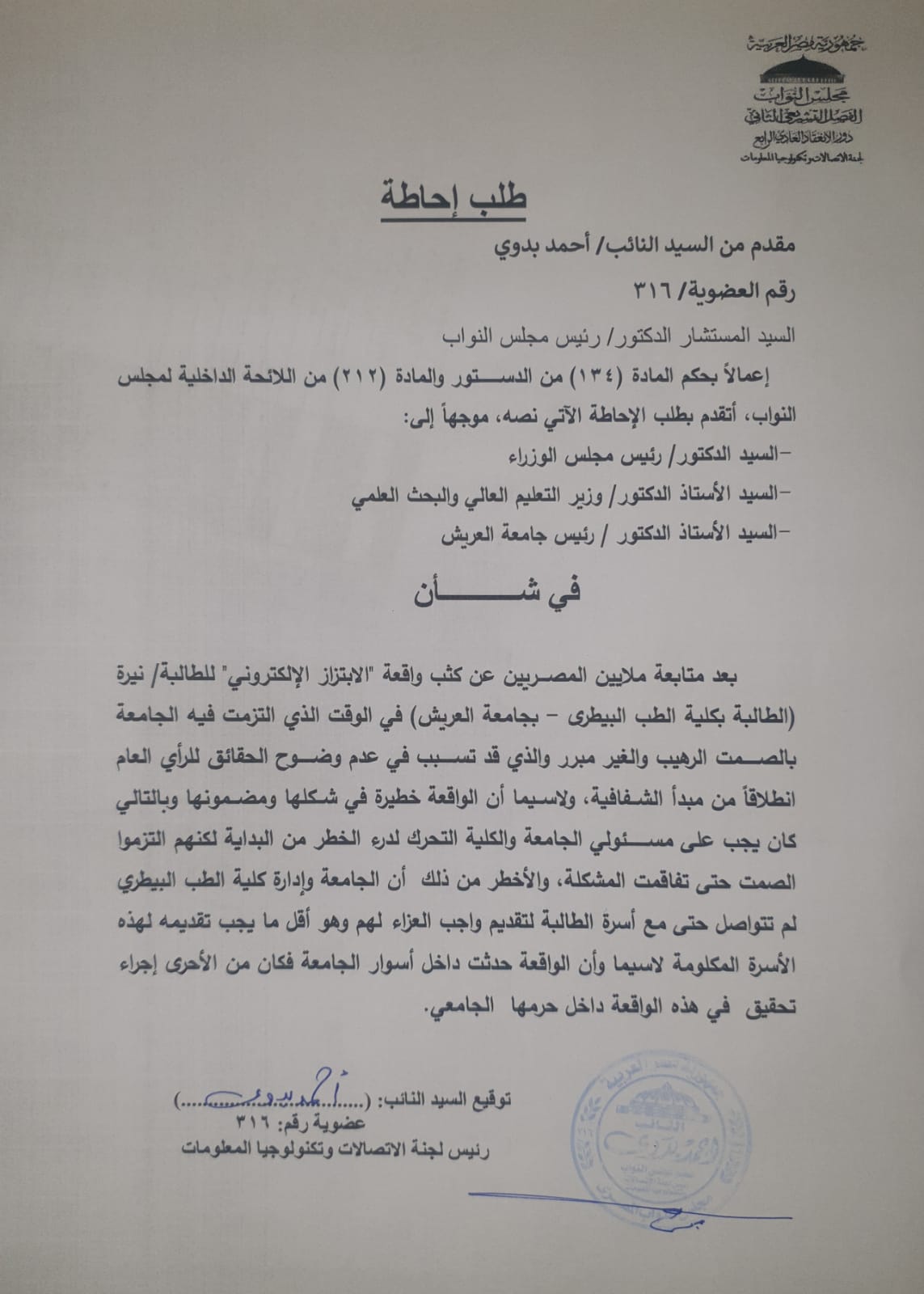 وقال بدوي في طلب الإحاطة الذي رصده موقع تحيا مصر: المستشار الدكتور حنفي جبالي، رئيس مجلس النواب، إعمالاً بحكم المادة (134) من الدستور والمادة (٢١٢) من اللائحة الداخلية لمجلس النواب، أتقدم بطلب الإحاطة الآتي نصه، موجهًا إلى الدكتور رئيس مجلس الوزراء، والدكتور وزير التعليم العالي والبحث العلمي، والدكتور رئيس جامعة العريش، بشأن أنه بعد متابعة ملايين المصريين عن كسـب واقعة "الابتزاز الإلكتروني" للطالبة نيرة (الطالبة بكلية الطب البيطري- بجامعة العريش) في الوقت الذي التزمت فيه الجامعة الصـمت الرهيب وغير المبرر، والذي قد تسبب في عدم وضـوح الحقائق للرأي العام، انطلاقاً من مبدأ الشفافية، لا سيما أن الواقعة خطيرة في شكلها ومضمونها.