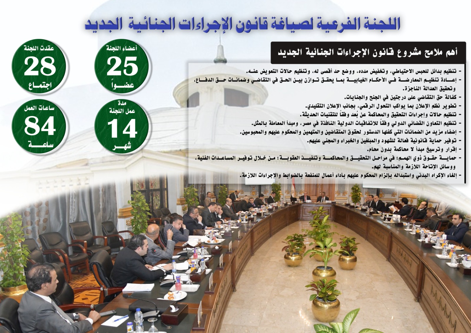 استعرضت اللجنة في اجتماع اليوم الصياغات النهائية لمواد مشروع القانون، وباقي المواد المرجأة وأبرزها تخفيض مدة الحبس الاحتياطي حيث وافقت اللجنة على تخفيض مدد الحبس الاحتياطي لتكون في الجنح 4 أشهر بدلاً من 6 اشهر ، وفي الجنايات 12 شهراً بدلاً من 18 شهراً، و18 شهراً بدلاً من سنتين إذا كانت العقوبة المقررة للجريمة السجن المؤبد أو الإعدام، وتحديد حد أقصى للحبس الاحتياطي من محكمة جنايات الدرجة الثانية أو محكمة النقض في الجرائم المعاقب عليها بالإعدام أو السجن المؤبد ليصبح سنتين بحد أقصى بدلاً من عدم التقيد بمدد، وانتهت اللجنة من إعداد مسودة مشروع قانون الإجراءات الجنائية الجديد بتوافق من جميع ممثلي الجهات والوزارات الممثلين في اللجنة، تمهيداً لعرضه على لجنة الشئون الدستورية والتشريعية، ومن ثم عرضه على مجلس النواب بجلساته العامة.