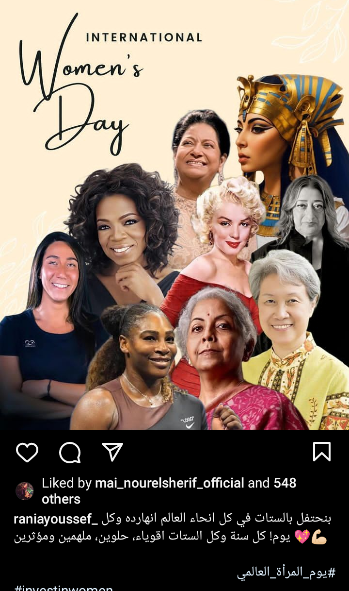 بينما كتبت الفنانة رانيا يوسف، عبر حسابها الرسمي بموقع تبادل الصور والفيديوهات انستجرام موجهة رسالة للمرأة في يومها العالمي: بنحتفل بالستات في كل انحاء العالم انهارده وكل يوم! كل سنة وكل الستات اقوياء، حلوين، ملهمين ومؤثرين.