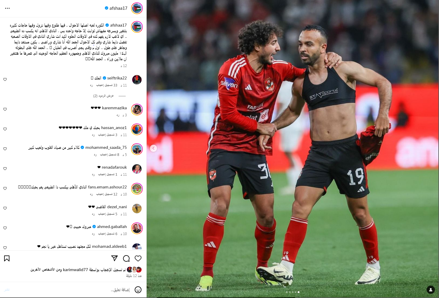 وكتب مجدي أفشة على حسابه الرسمي"إنستجرام":" الكورة لعبه اصلها الاحوال، فيها طلوع، وفيها نزول، وفيها حاجات كثيرة بتتغير وبسرعو مفيهاش ثوابت إلا حاجه واحده بس النادي الـهلي إنه يكسب ده الطبيعي".