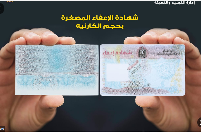 - الشهادة التي يتم استخراجها، هي شهادة الإعفاء من الخدمة العسكرية المصغرة (بحجم الكارنية).