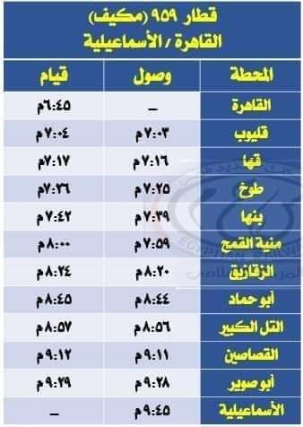 - تعديل ميعاد قيام قطار 959 ثالثة مكيفة القاهرة / الإسماعيلية ليقوم من محطة القاهرة الساعة 6:45 مساءًا بدلاًً من الساعة 7:50 مساءًا ويصل محطة الإسماعيلية الساعة 9:45 مساءاً2